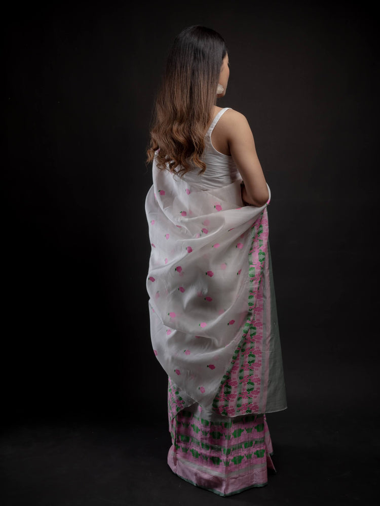 An enchanting drape, this pure Kesa Paat silk mekhela sador in ivory showcases blissful joba (hibiscus) floral pattern throughout the body. Designed in a modern, minimalist way, the alluring highlights of pink and sage green adds a playful touch to this breezy summer drape.