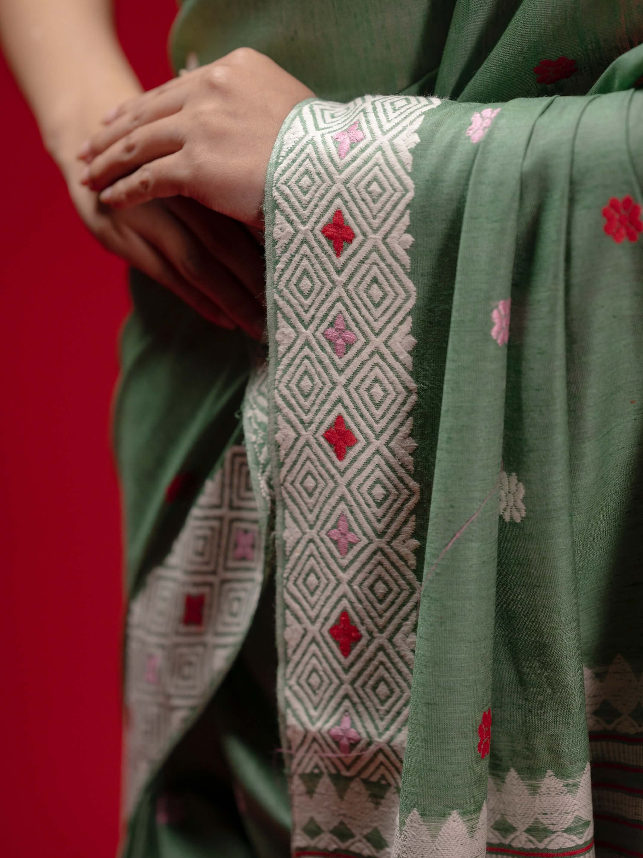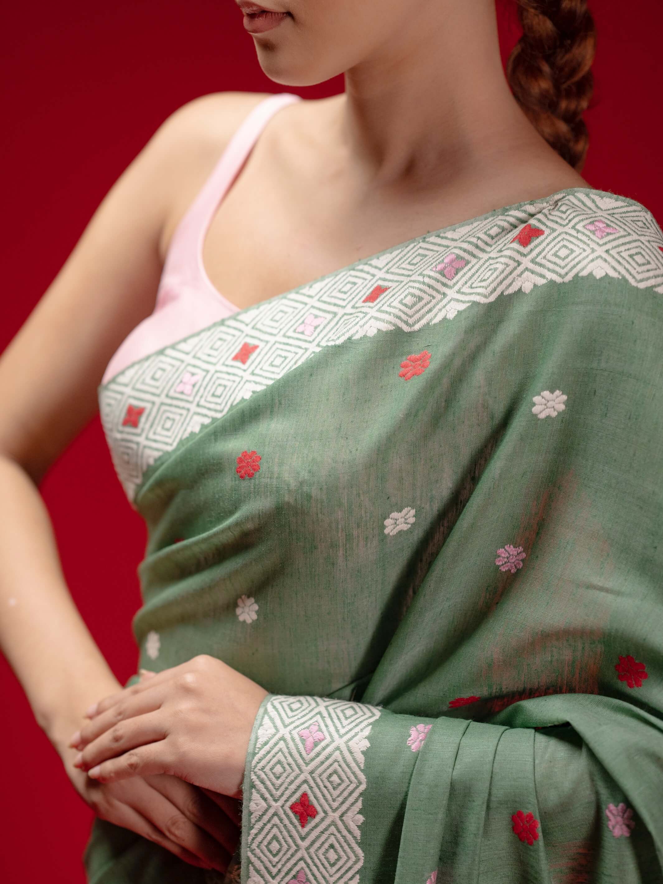 With a soft and pleasing colour palette, this Eri Kesa Paat silk saree in soothing sage green, evoking a sense of freshness and harmony, is a reflection of the perfect weaving tradition that is hundreds of years old. The mix of floral and geometric tribal patterns in white, speckled with multicoloured meenakari, the immaculately woven borfi (diamond) border lends a wonderful contemporary vibe, making this the perfect saree for the rooted yet progressive woman.