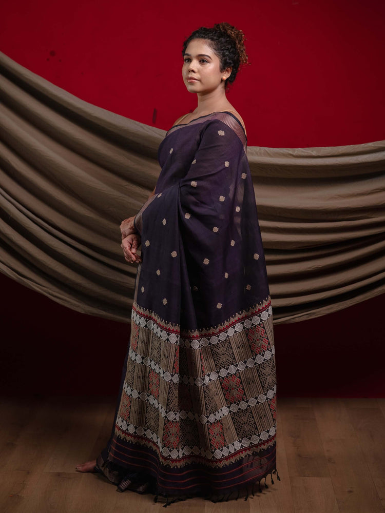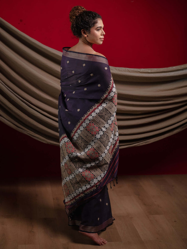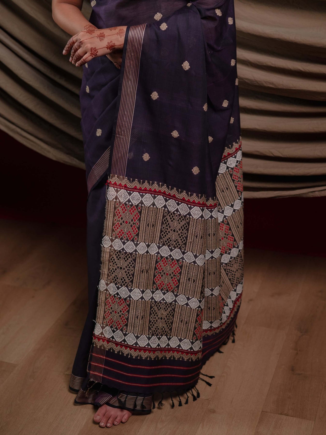 Crafted in ingenious weaving tradition, this deep, luxurious silk cotton saree made with diaphanous kesa paat silk and indigenous cotton, lends a sense of charm and elegance to the wearer. Enhanced with a Tussar silk striped selvedge, the intricate Karbi tribal motifs in Muga Ghisa and invigorating red meenakari, are the most remarkable aspect of this masterpiece. A symphony created by our brilliant weavers, this breathtaking saree is an artwork in itself.