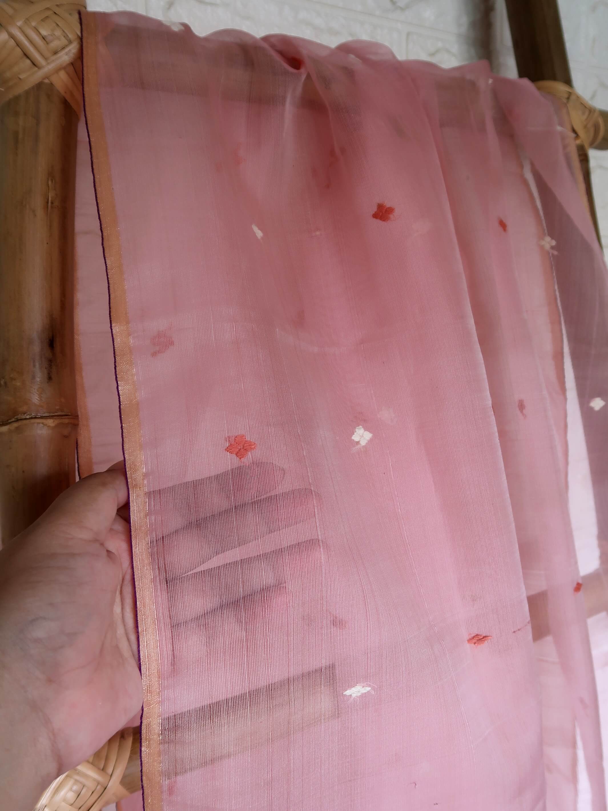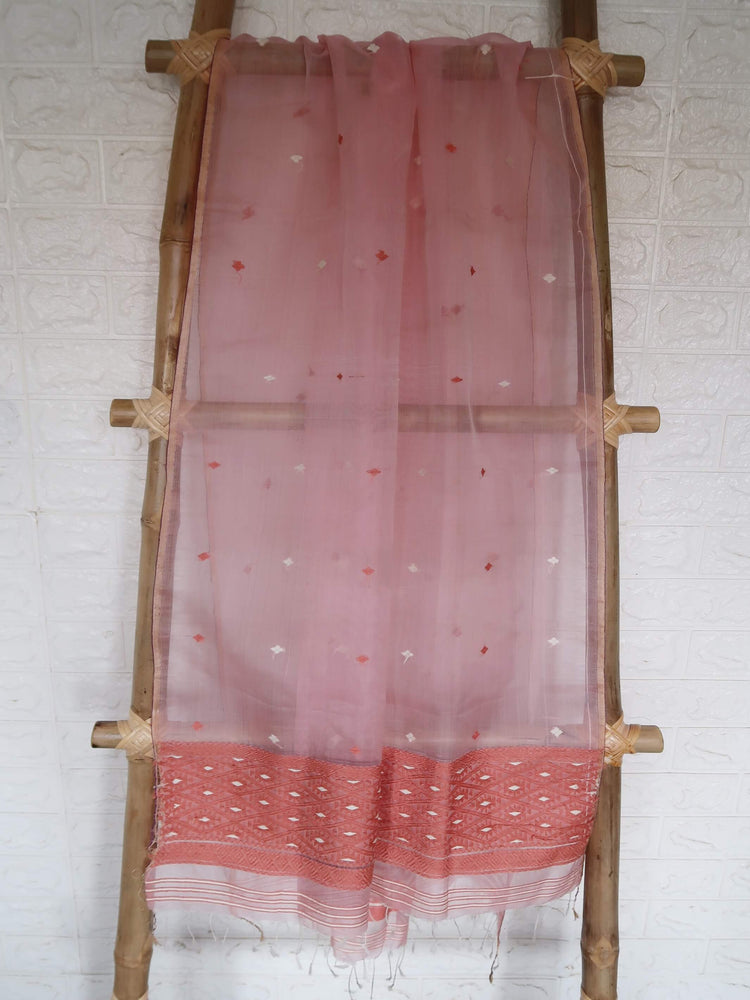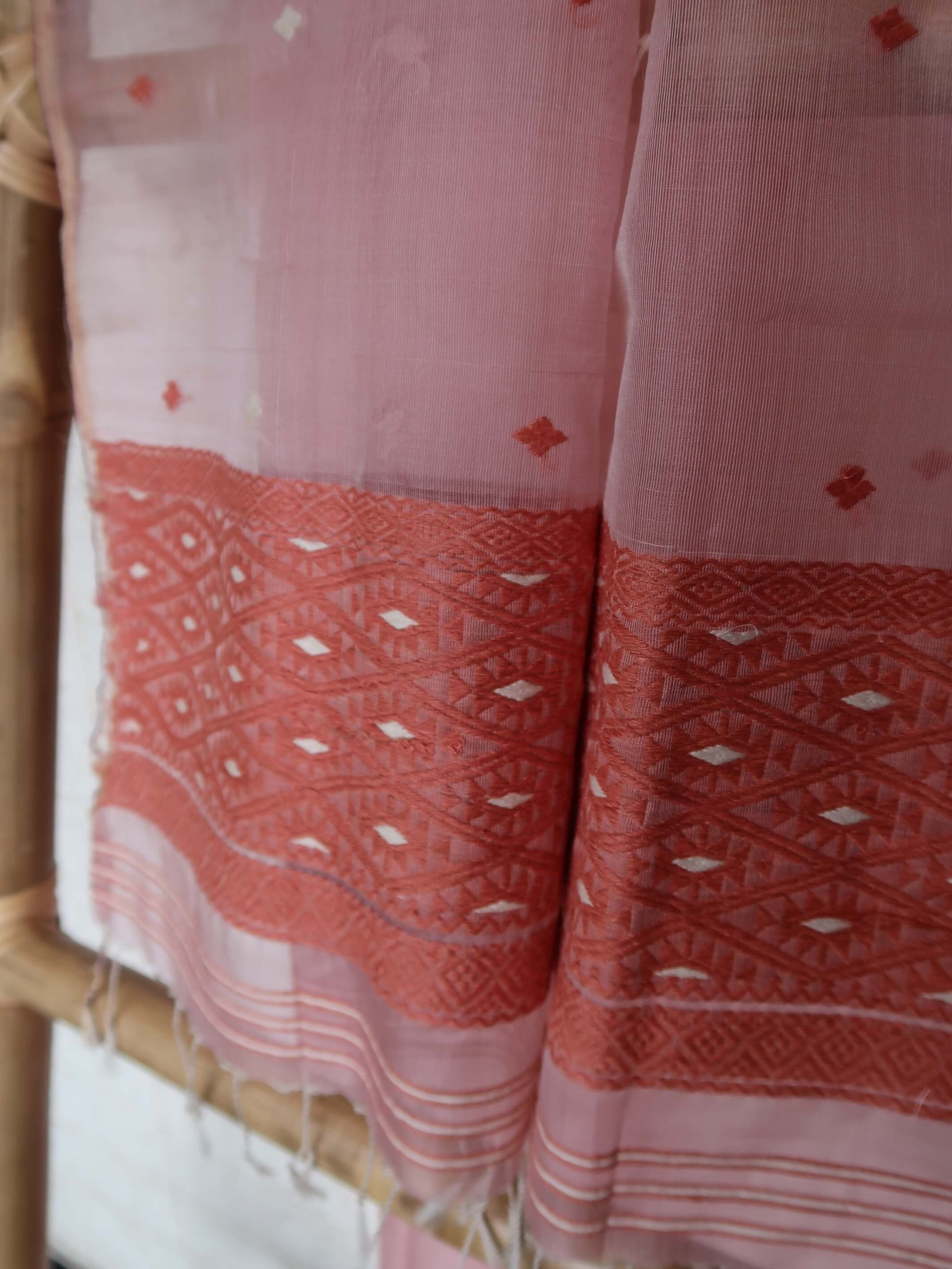 With refined details for maximum effect and imagined in a tonal hue with heritage motifs on a pastel pink silken base, this Assam silk dupatta is truly luxurious and exudes a timeless appeal. Finished with handmade tassels.