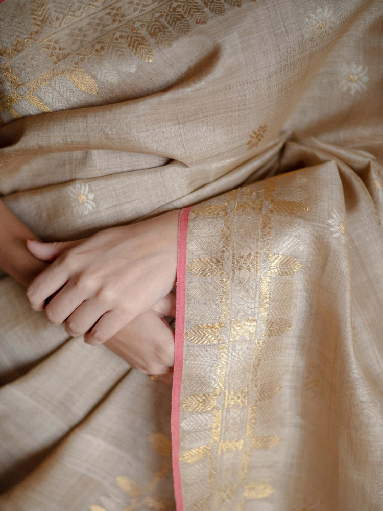 Historically donned by the royal families of Assam, this Muga silk saree is the perfect piece for a rich, regal and distinctively traditional look. The shimmering golden base evokes the warmth of joyous gatherings while zari meenakari adds a touch of celebration. The cascading pallu enhanced with a mix of floral and geometric tribal design completes this masterpiece, ready to turn heads at every festive gathering.