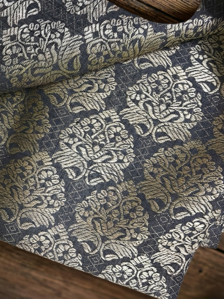 Crafted for the discerning eye that values timeless elegance and artisanal detail, this exquisite fabric features a meticulously woven, opulent damask pattern in a shimmering Tussar silk palette, set against a rich, deep charcoal Eri silk base. The symmetrical, stylized motifs are framed by an elegant diamond-grid overlay that spans the fabric's entire body. This complex brocade weave ensures a subtle play of light and shadow, highlighting the refined, handwoven texture. Whether it’s a modern cut to pair with traditional separates or a classic, high-neck design, the structured yet supple nature of this brocade is ideal for intricate tailoring and a truly flattering fit.