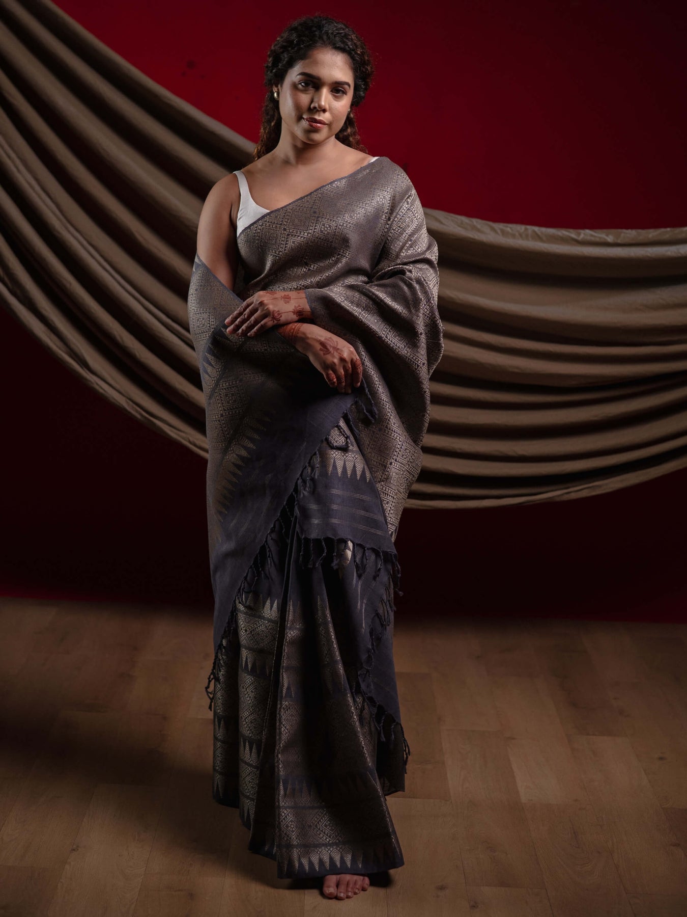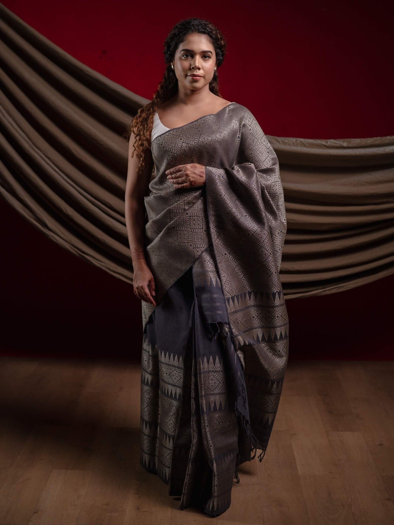 Embrace the perfect harmony of tradition and elegance with our exquisite pure Eri silk mekhela sador, masterfully handwoven with a timeless all-over design in luxurious Tussar silk. Accentuated with traditional Bodo tribal motifs painstakingly woven over weeks, its intricate pattern and subtle sheen reflects the meticulous handwork and authentic Assam handloom artistry. A distinctive piece crafted for the discerning, the deep charcoal-grey base creates a stunning canvas for the shimmering golden-cream traditional patterns that dance across the fabric. Handwoven luxury!