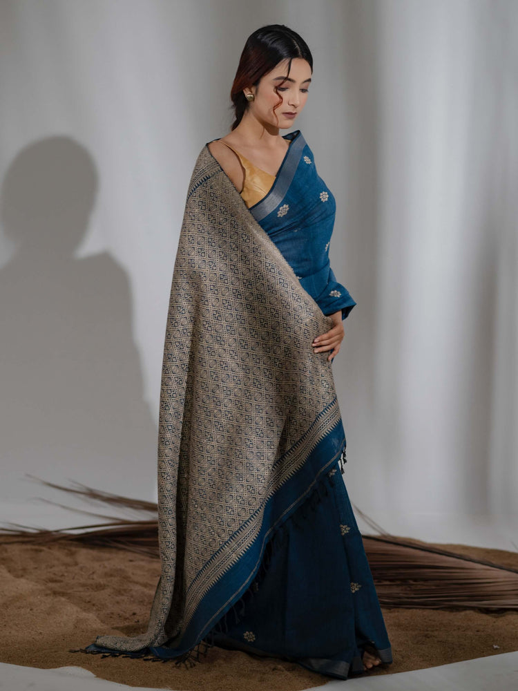 A handloom delight, this elegant silk cotton saree in indigo dye forms an enticing base for the elaborate tribal Mishing motifs in Muga spun silk. Bringing a contemporary interpretation to an ancient aesthetic, this classic handloom weave will adapt to your every mood and occasion.