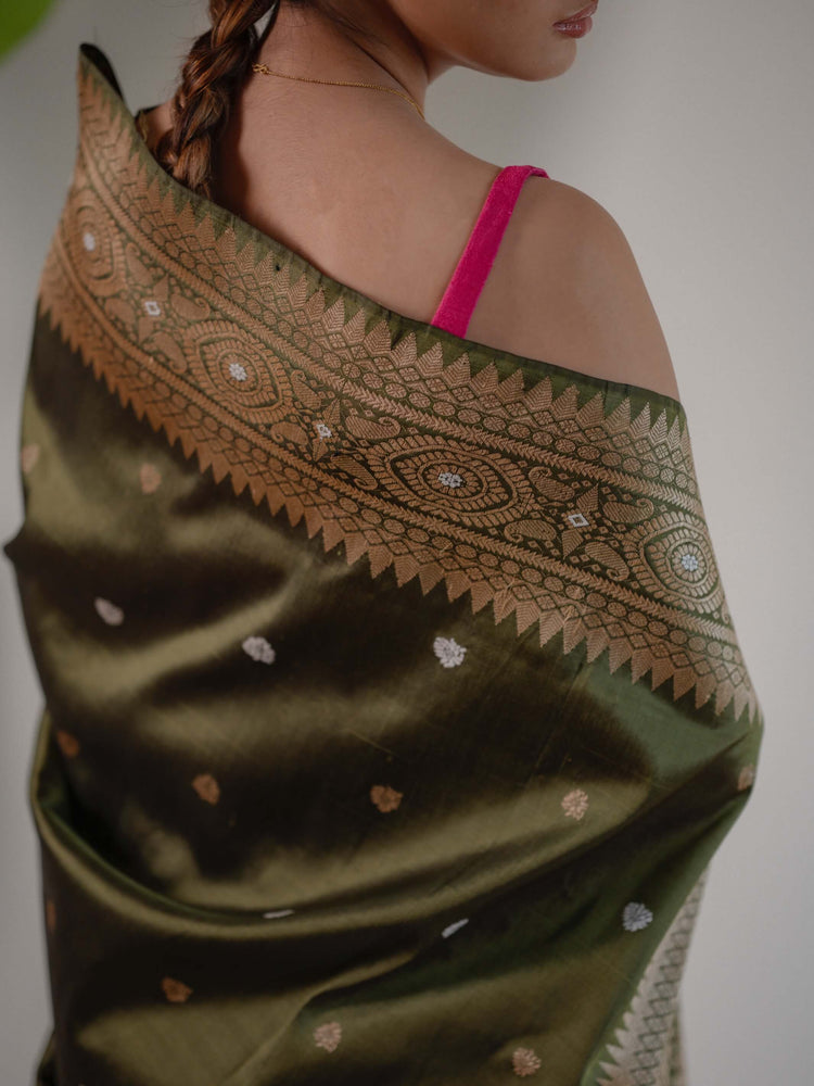 Marrying the stability of olive green and the regalia of pure Muga silk, this mulberry silk mekhela sador is the perfect choice to stand out during festivities. Time honoured Bodo tribal motifs and small butis all over the body are set off by an intricate border painstakingly woven over weeks. A real eye-catcher for any celebration.