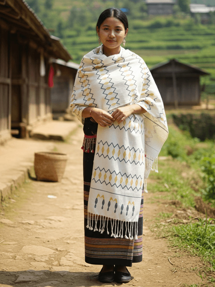 The sumptuousness of pure silk combines with Naga-inspired hornbill design - symbolic of status, power and royalty - to create this memorable Eri silk shawl with a character all of its own. With fringed ends enhancing the elegant drape and tribal patterns animated by the sheen of premium silk, this shawl is eye-catching without being overpowering, and makes an ideal gift for anyone who appreciates the finer things in life.
