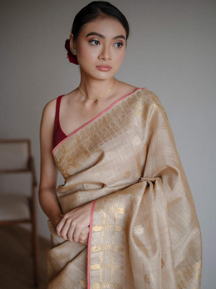 Historically donned by the royal families of Assam, this Muga silk saree is the perfect piece for a rich, regal and distinctively traditional look. The shimmering golden base evokes the warmth of joyous gatherings while zari meenakari adds a touch of celebration. The cascading pallu enhanced with a mix of floral and geometric tribal design completes this masterpiece, ready to turn heads at every festive gathering.