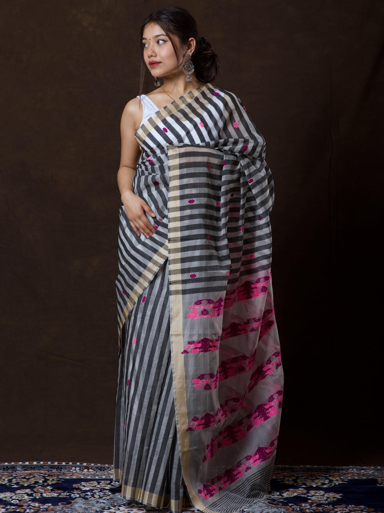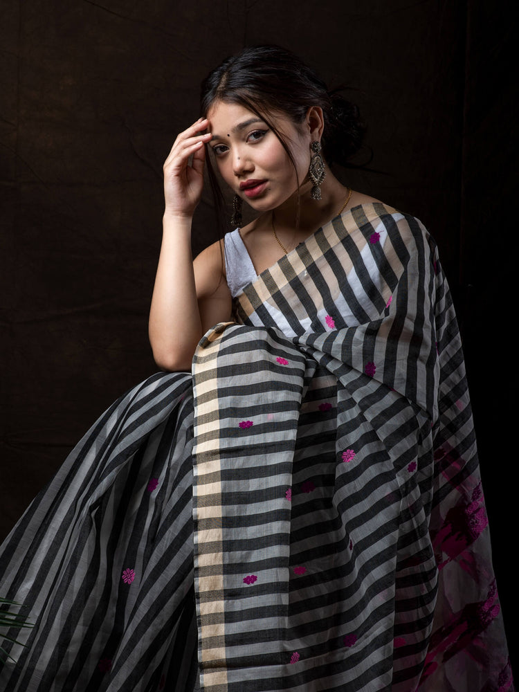 A stunning beauty to celebrate the most classic colour combination that is timeless in its elegance, symbolic of both mystery and purity. One that befits a place in a seasoned saree collector's wardrobe, this pure Kesa Paat silk saree has stripes of black and white and is highlighted by the occasional hints of magenta & pink.