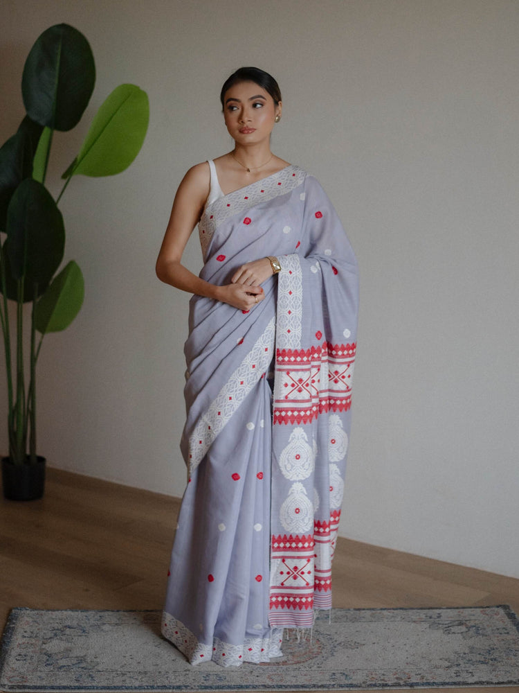 With a soft and pleasing colour palette, this Eri Kesa Paat silk saree in soothing periwinkle is a reflection of the perfect weaving tradition that is hundreds of years old. Time honoured Karbi tribal motifs in white Eri silk, speckled with fiery red meenakari and the immaculately woven border lends a wonderful contemporary vibe, making this the perfect saree for the rooted yet progressive woman.⁣