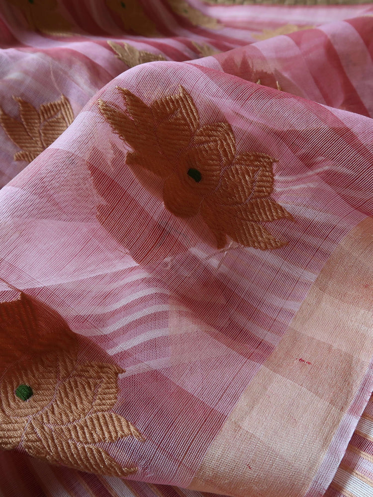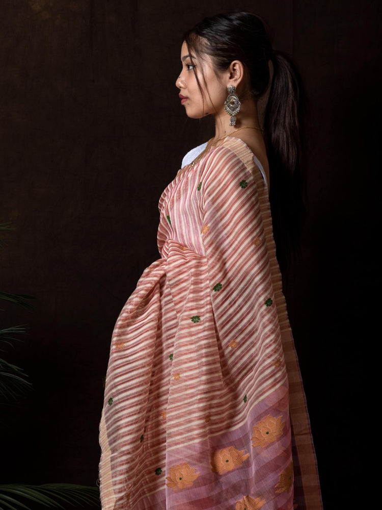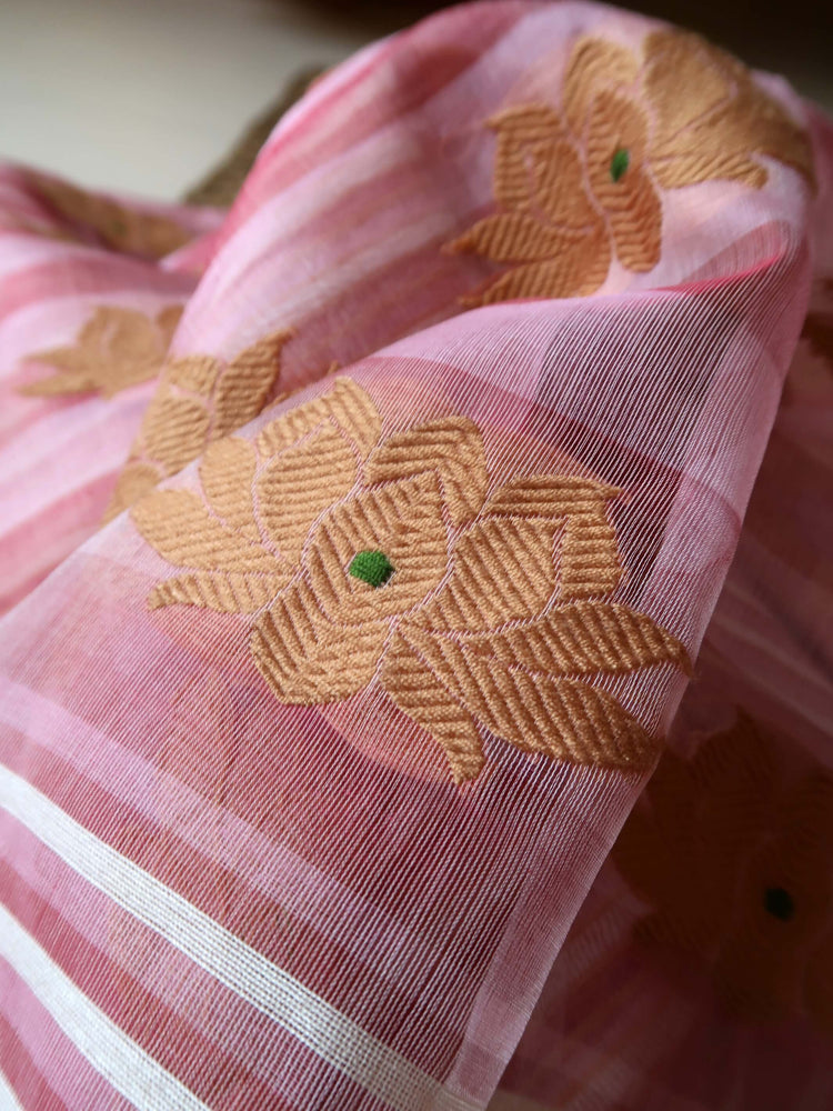 Exuding everlasting elegance, this Kesa Paat silk saree has left us spellbound! Alluring gradient stripes in eye-catching red and rose pink that sends a message of playfulness and positivity, adorned with our newest addition podum (lotus) motifs on the pallu. An endearing handwoven classic embodying the fiesta-ready grace the season demands.