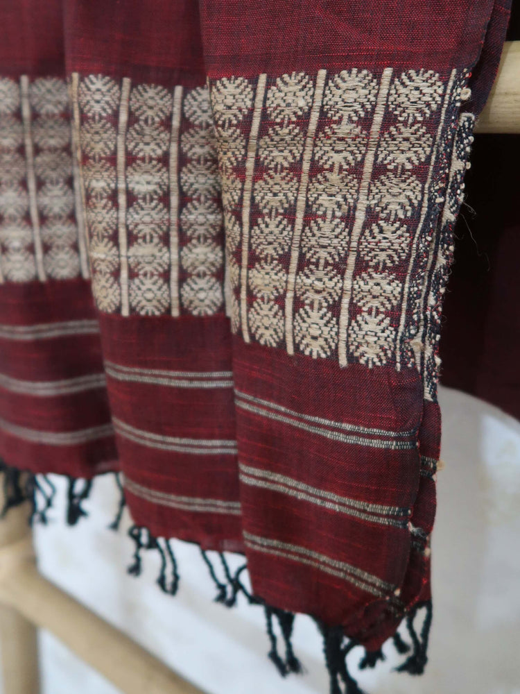 Get a contemporary Indian look by accessorizing this elegant ruby red dupatta with any outfit in a contrasting hue. Woven from the finest cotton silk, the look of the dupatta is enhanced by traditional motifs and floral patterns in Muga Ghisa.