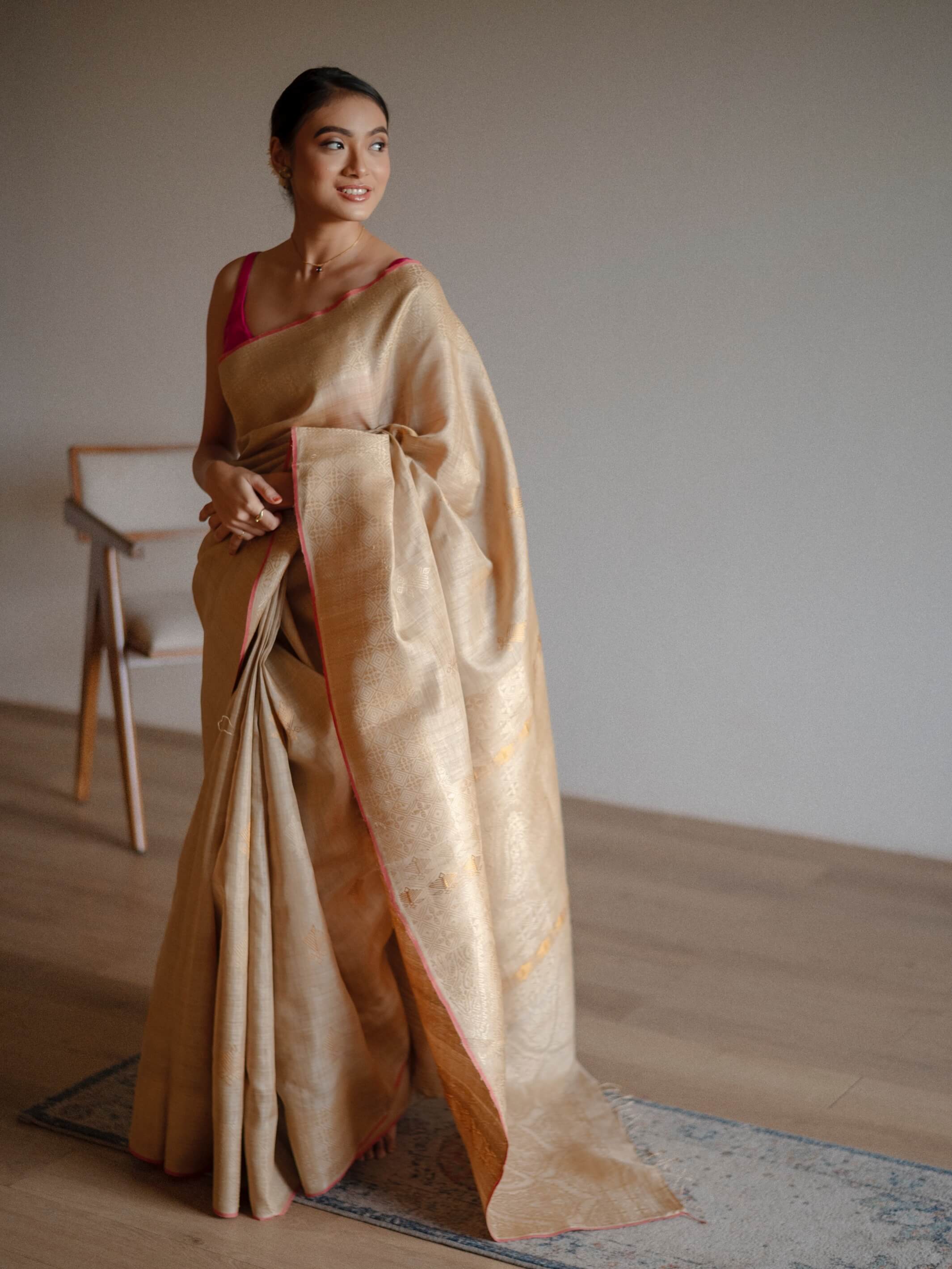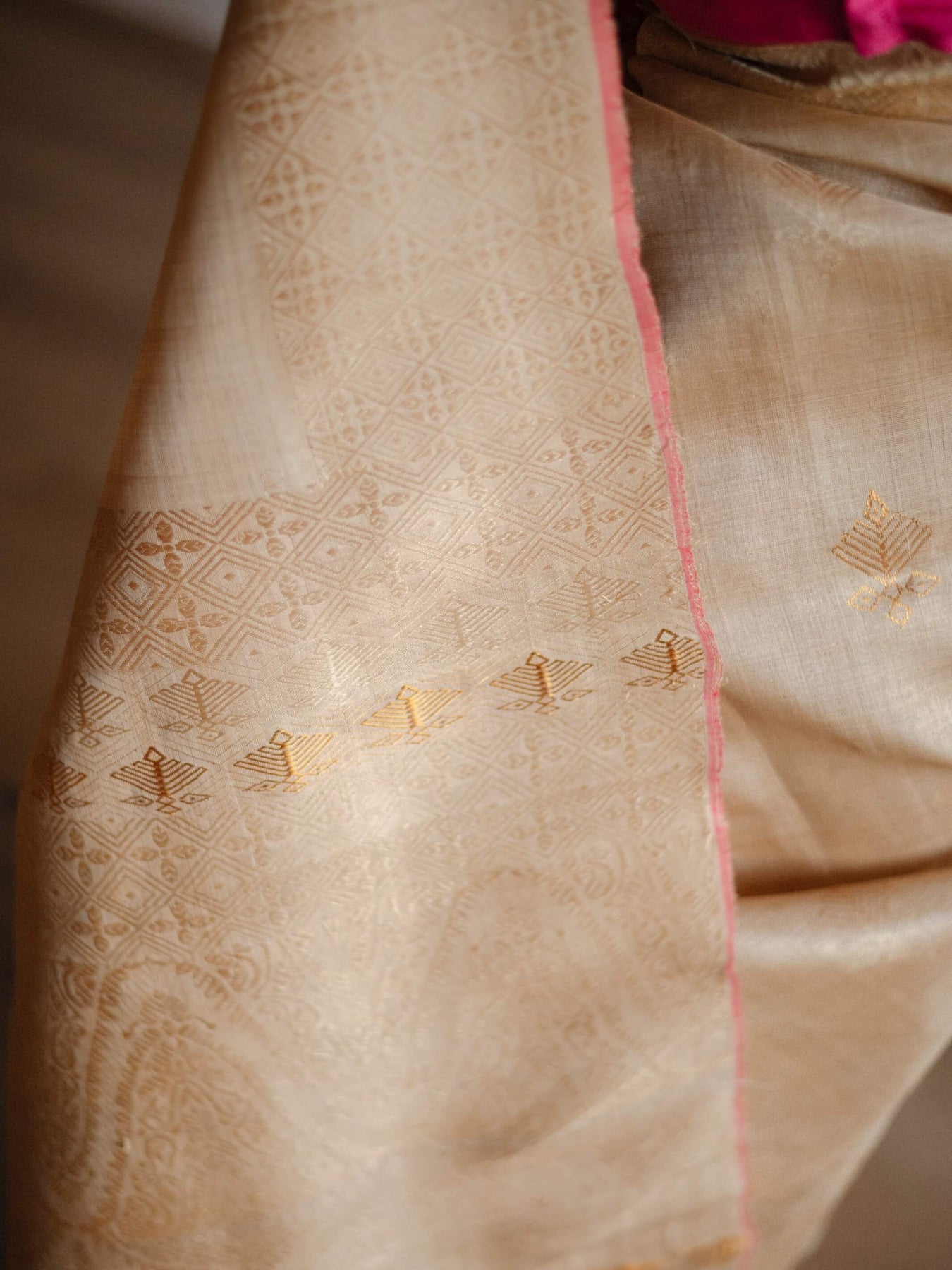 A handloom delight, this Muga silk saree forms an enticing base for the elegant foliage  motifs woven all over the pallu. Crafted in ingenious weaving tradition using natural tonal Muga silk as design yarn, the design sensibility and the poetic beauty of the intricate zari detailing are the most remarkable aspect of this handwoven masterpiece.