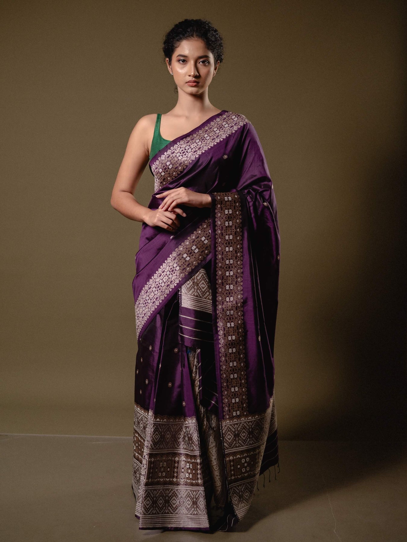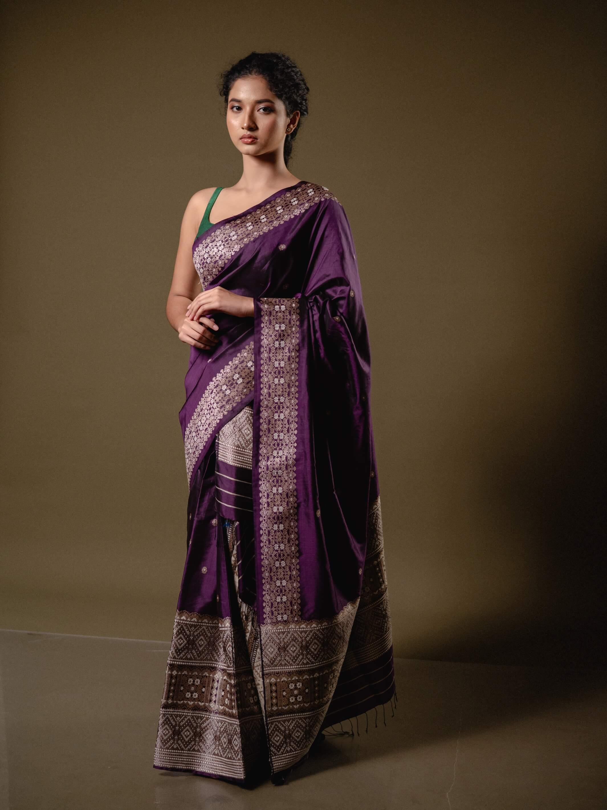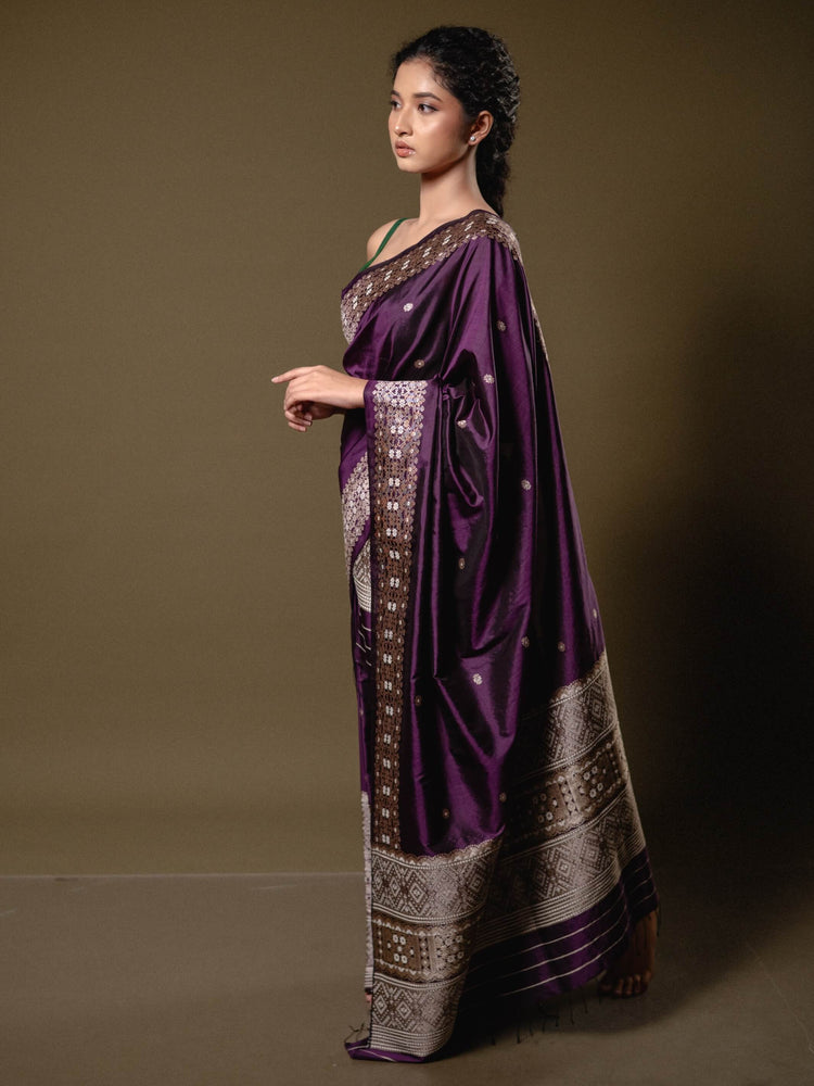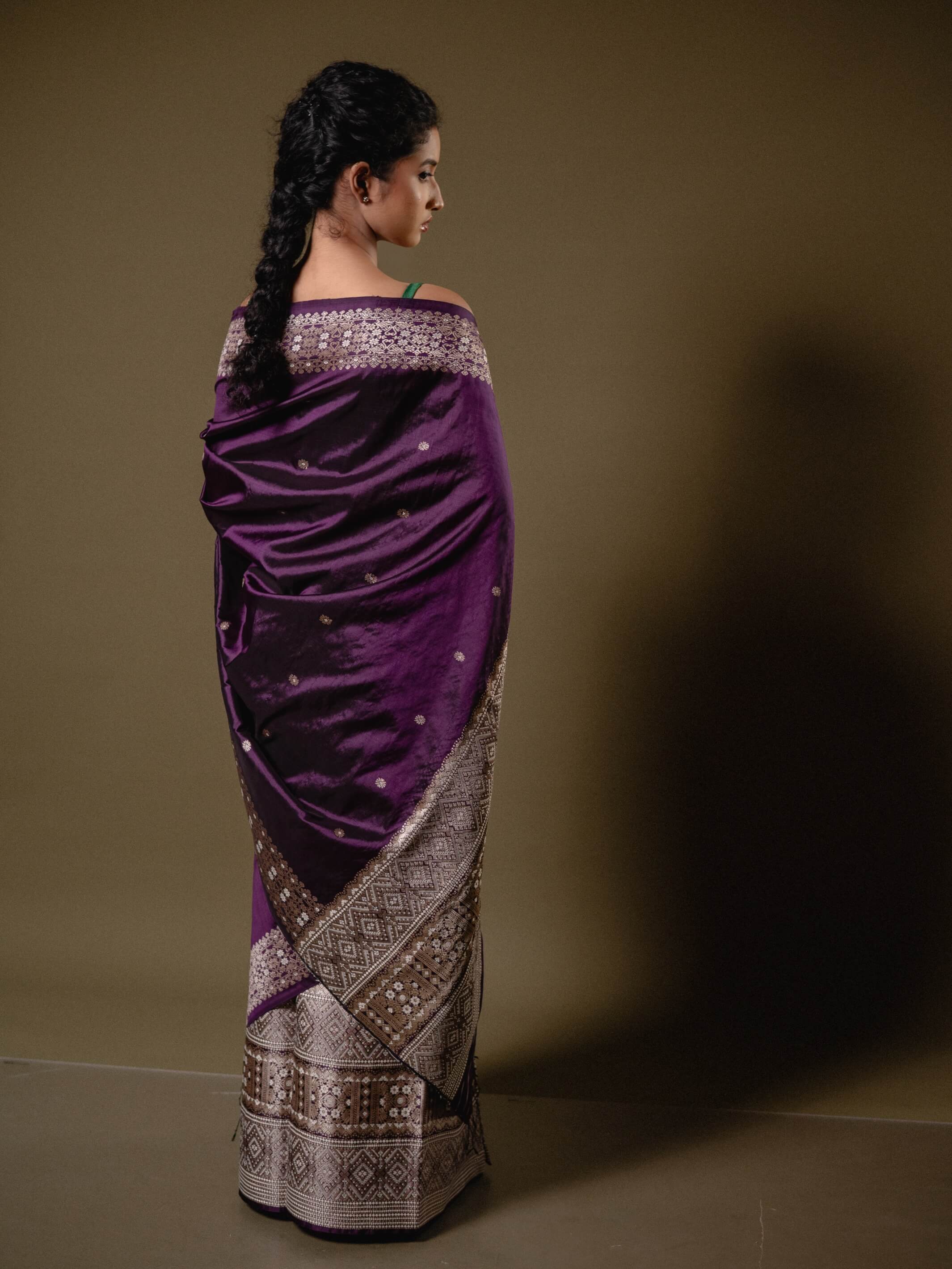 Marrying the nobility of royal purple and the regalia of pure Muga silk, this mulberry silk mekhela sador is the perfect choice to stand out during festivities. Heritage motifs and small butis all over the body are set off by an intricate border painstakingly woven over weeks. A real eye-catcher for any celebration.