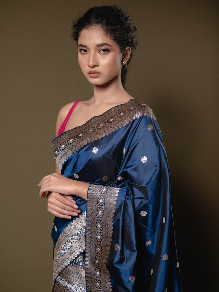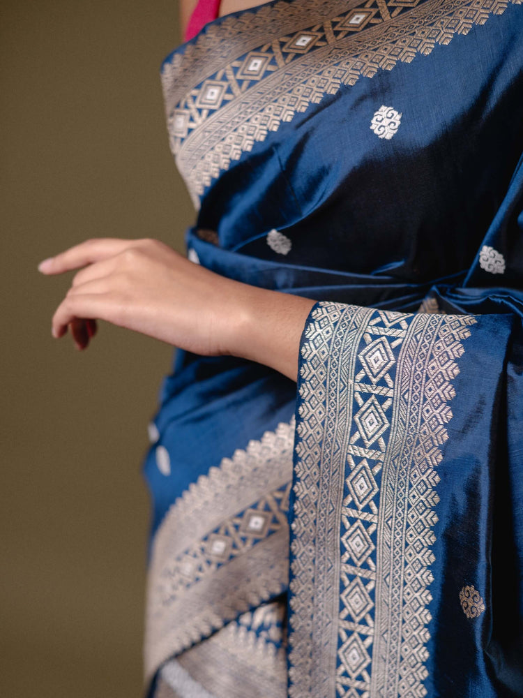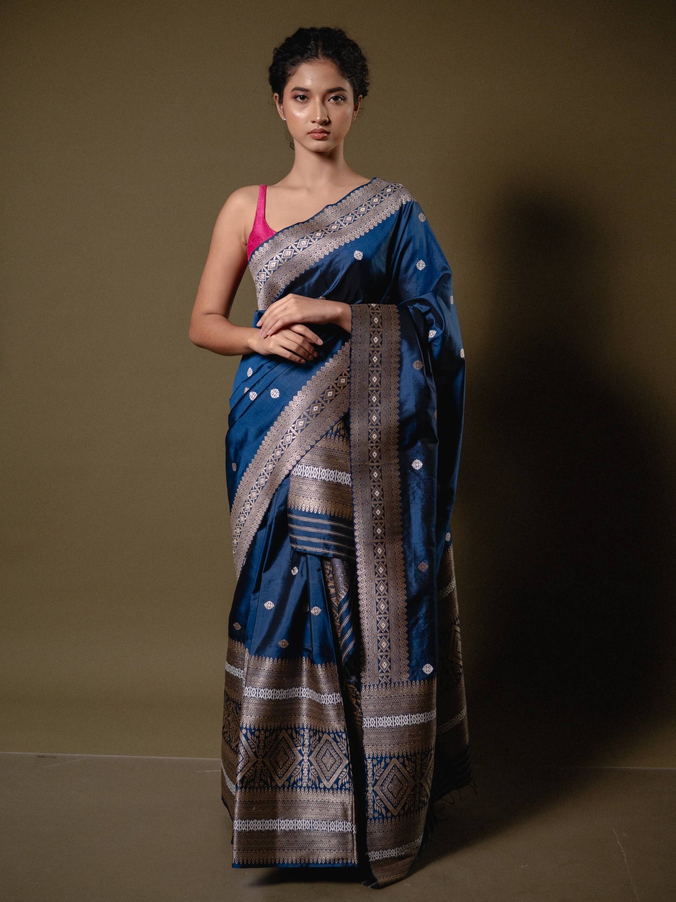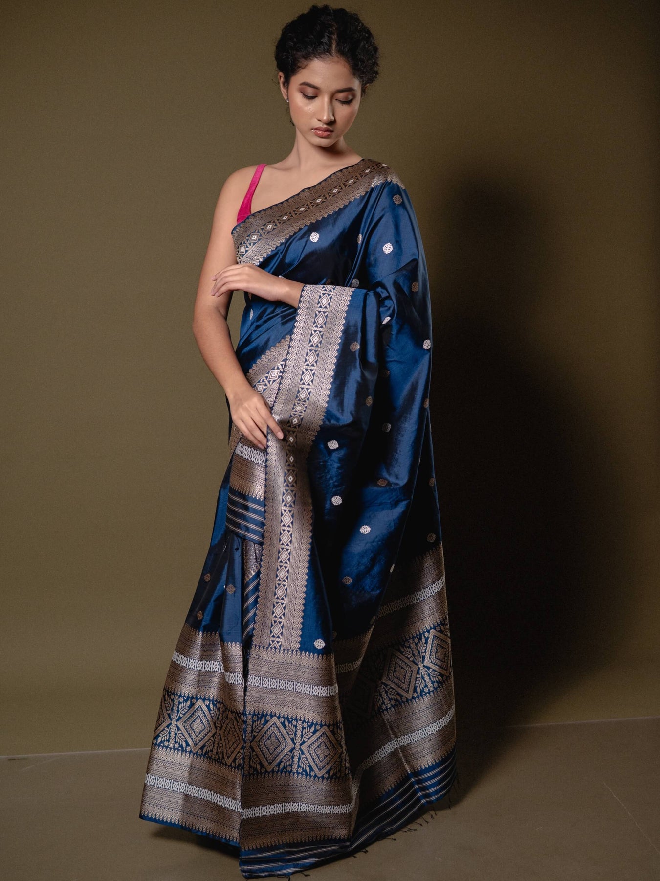 Marrying the richness of jewel-toned teal blue and the sophistication of Muga silk, this opulent Paat silk mekhela sador is the perfect choice for when you want your presence to do all the talking. Exquisite borfi (diamond) motifs and small butis all over the body are set off by an intricately woven border painstakingly woven over weeks. A masterpiece that celebrates modern grace - perfect for festivities that call for poise and poetry.